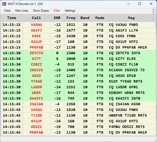 With the WSJT Decode List enabled, a list of recent callsigns will be displayed with callsign colors indicating each callsign’s contest priority (by default, these will be grey for dupe or zero points, blue for workable but not a multiplier, red for new multipliers). Callsigns in the corresponding WSJT-X/JTDX Band Activity panel will reflect those same contest color priorities as a background color. The only callsigns that are marked are callsigns of stations calling CQ (or optionally, 73, RR73 and/or RRR as well). Callsigns of stations with QSOs in progress are not marked and do not appear in the WSJT Decode List. Different time cycles will be indicated in the window by different background color shading to help you determine whether the CQ that station sent was in the current cycle or a previous cycle.