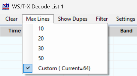 Max Lines – used to control the number of lines stored. This may be different from the number of lines actually displayed. If the number of stored lines is larger than the window can display, there will be a scroll bar to allow scrolling back through the stored lines. The larger the number of stored lines, the more computational load, meaning that on slower computers, you will want to keep the number of lines relatively small. Default values of 10, 20, 30 and 50 are available in the popup menu, or you can choose Custom to enter a different number.