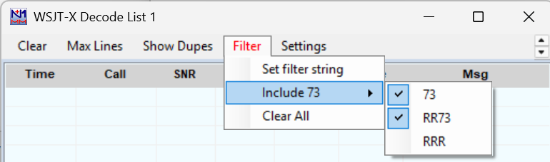 To include “73” messages to facilitate tail-ending, choose the “Include 73” option. The submenu that opens will allow you to to select or deselect messages containing “73”, “RR73”, or “RRR”. This sub menu will stay open and not close until you click anywhere outside the menu.