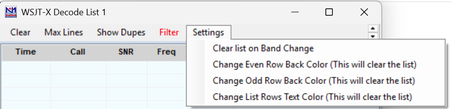 The other three items are used to customize the background colors for the two (odd/even) cycles and the foreground text color for text other than callsigns. Using any of these three o
