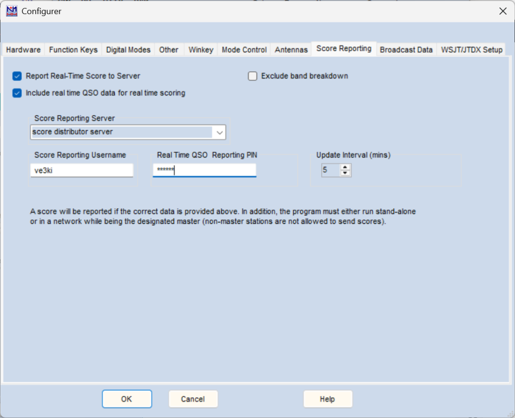 - Score Reporting Username and Real Time QSO Reporting PIN (formerly called Score Reporting Password; only appears if the real time QSO data checkbox is checked) – For security reasons, the real time score reporting web sites require that you register your callsign and a system-assigned PIN. Once you have done so, enter them in the textboxes provided.